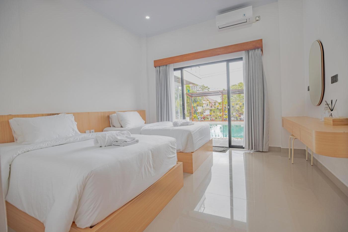 Twin Room with Pool View. The twin room features air conditioning, a wardrobe, a terrace with pool views as well as a private bathroom boasting a shower. The unit has 2 beds. ;
